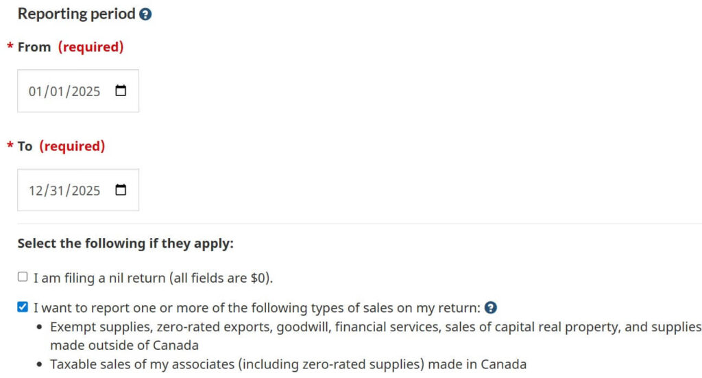 Enter the reporting period (most businesses use the calendar year) and select whether you are reporting zero rated income (sales that you did not collect tax on such as foreign sales)